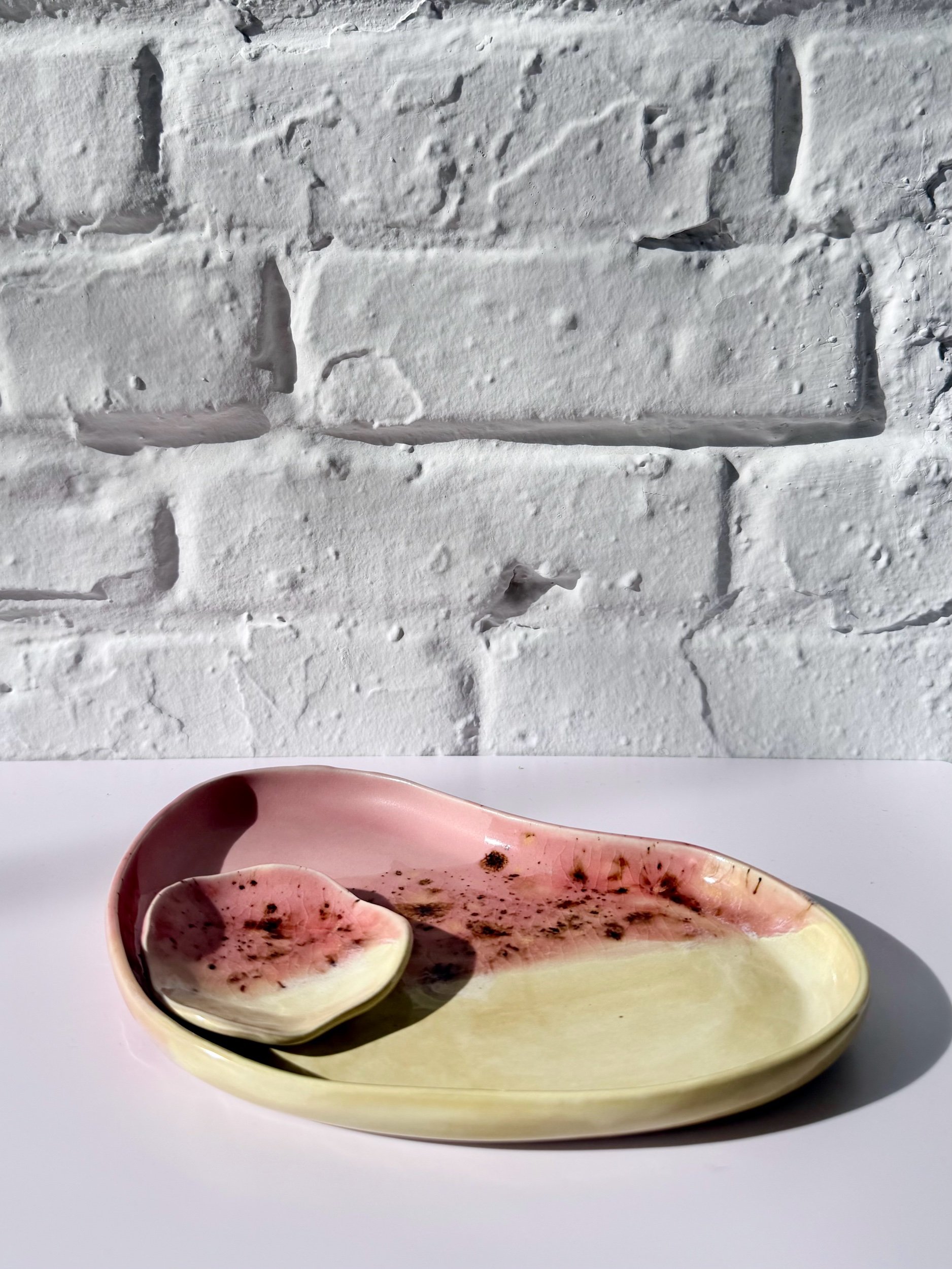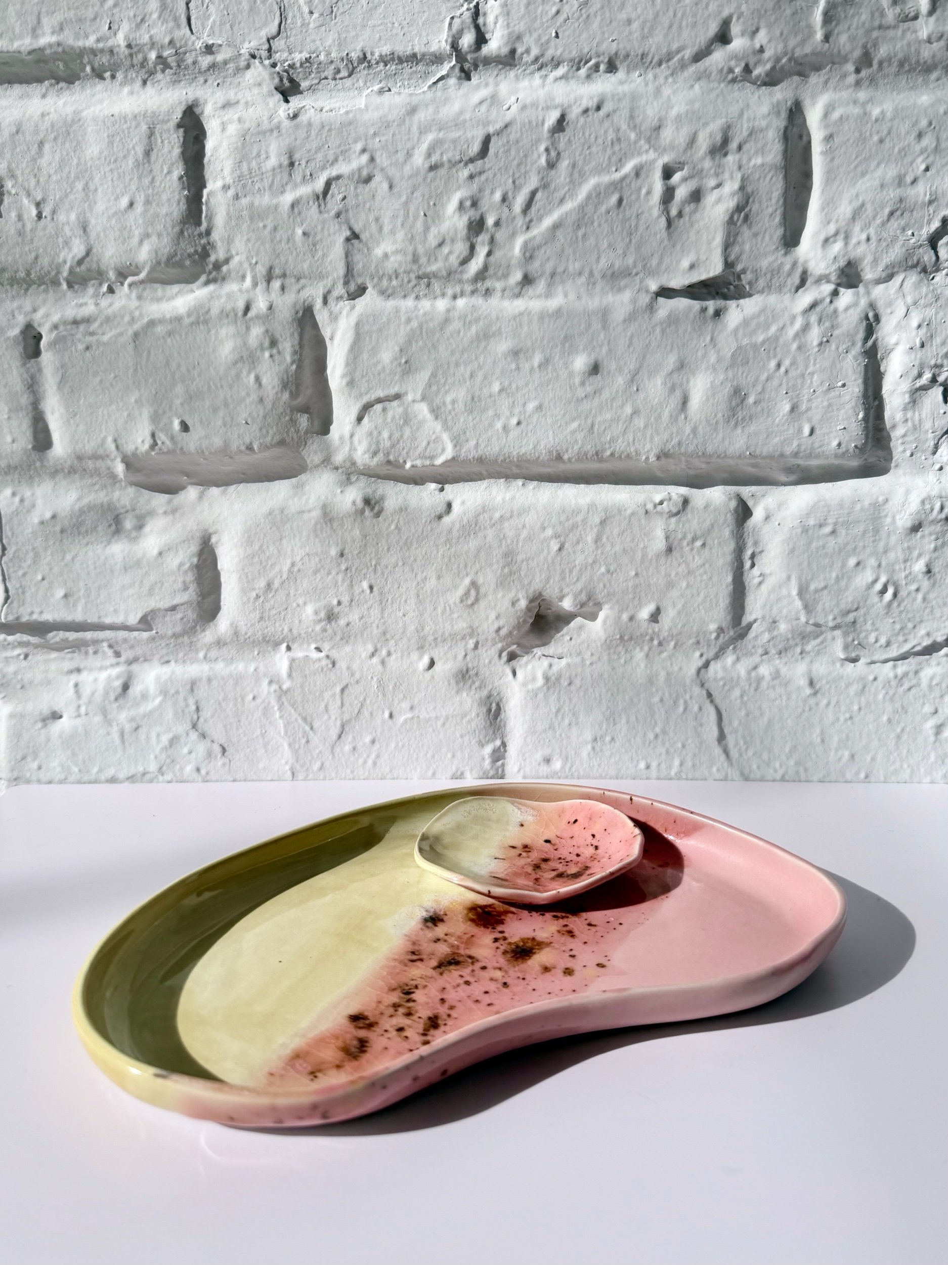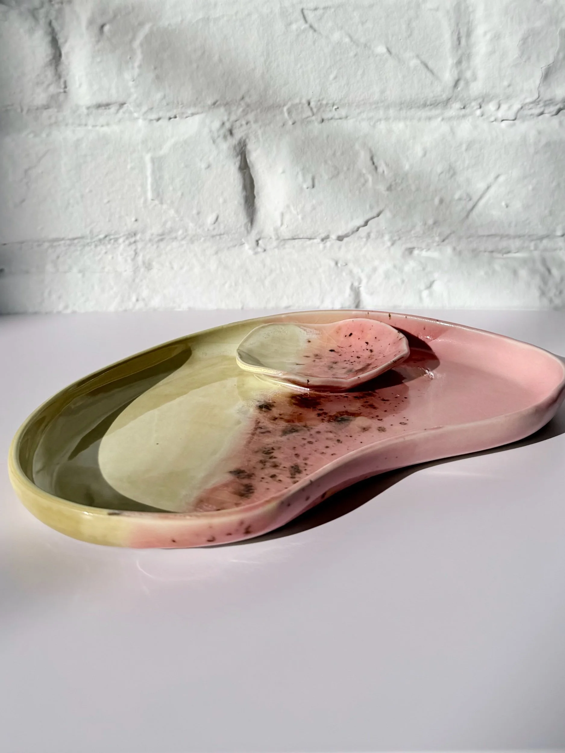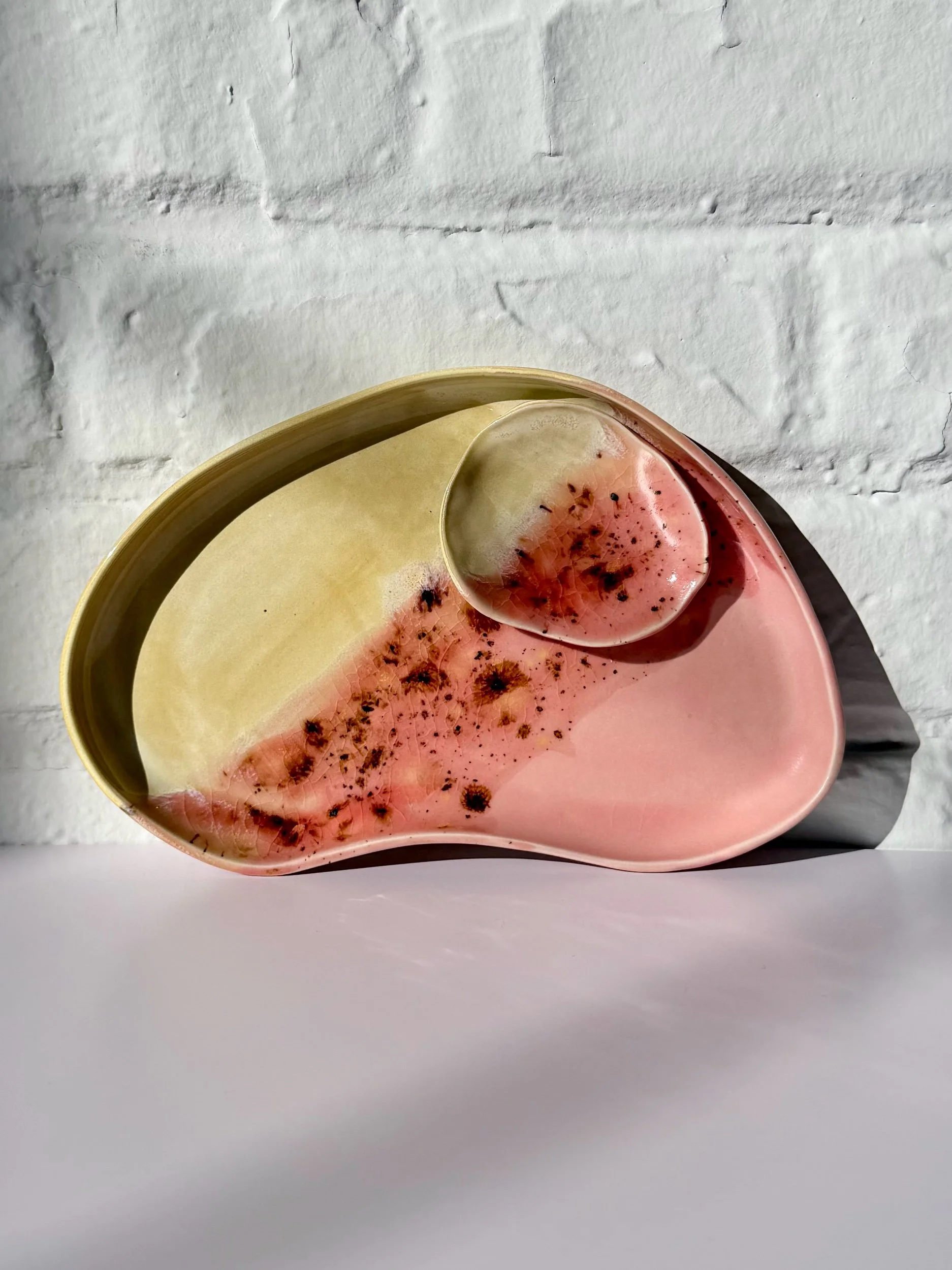 The Orbit Duo Platter is a handmade oval ceramic piece designed for everyday versatility. Featuring an attached small bowl, it can be used for serving, holding small objects, or styling as a simple catchall. Each platter is one of a kind, made to bring quiet beauty and function to any space.