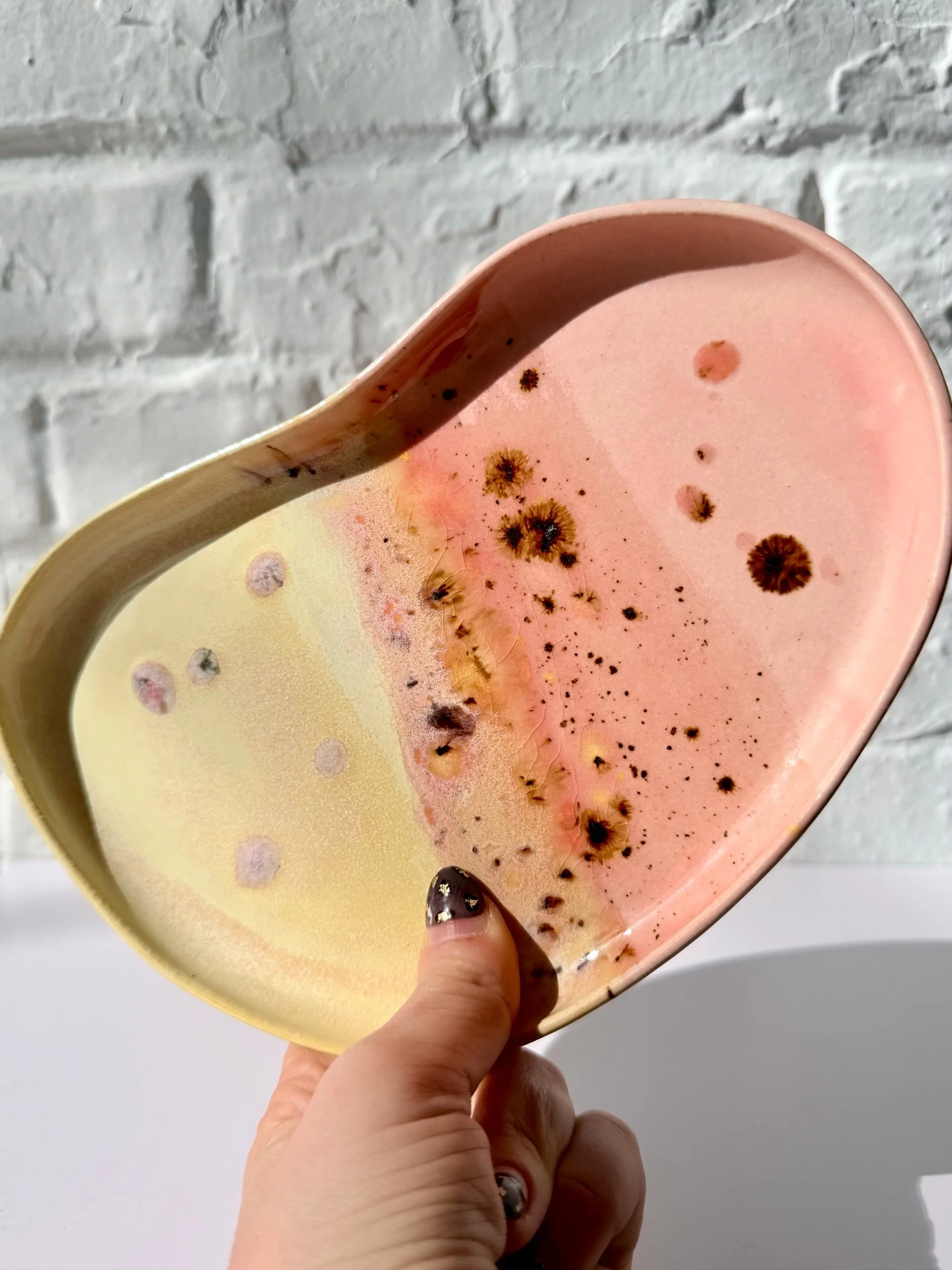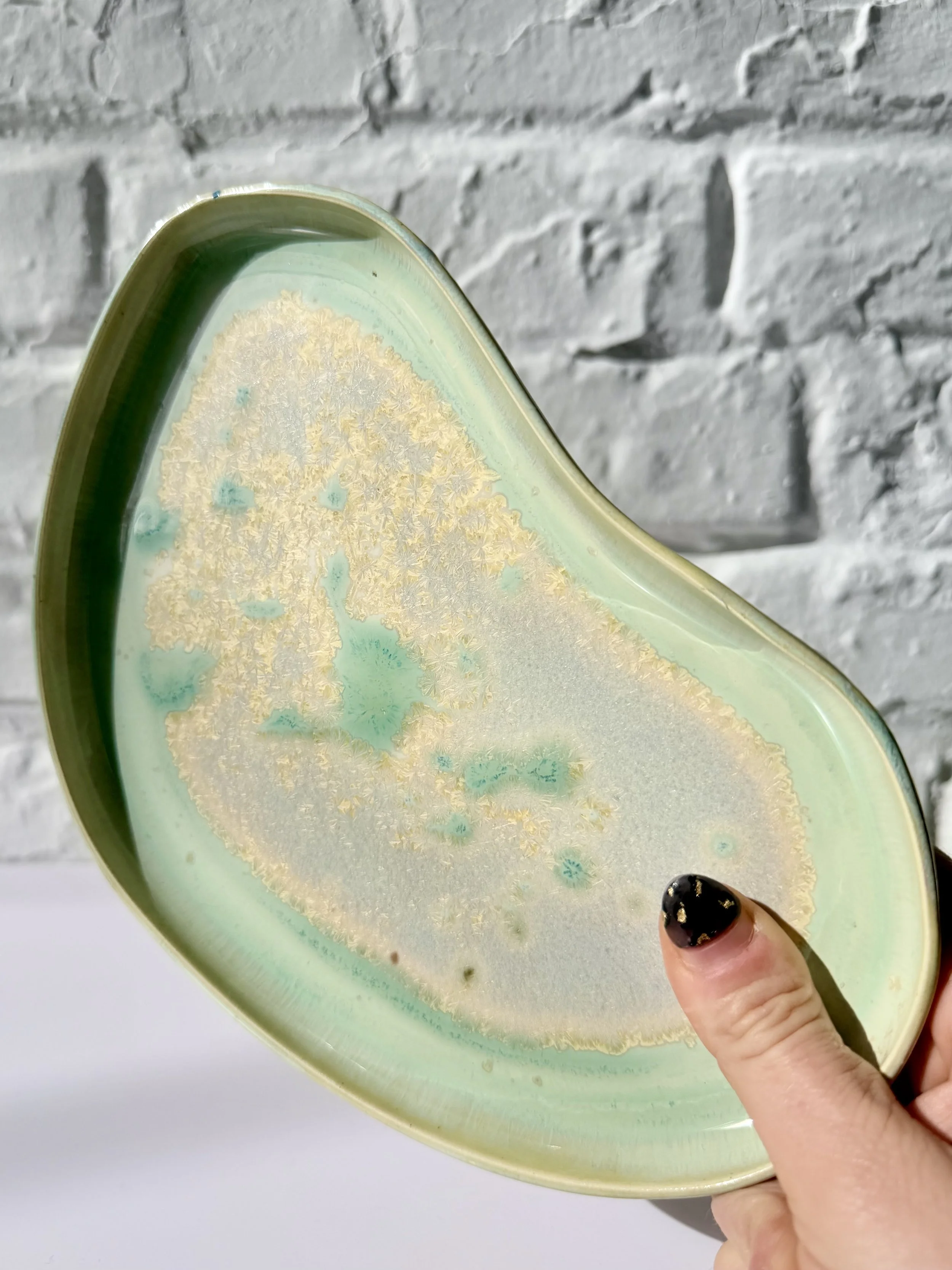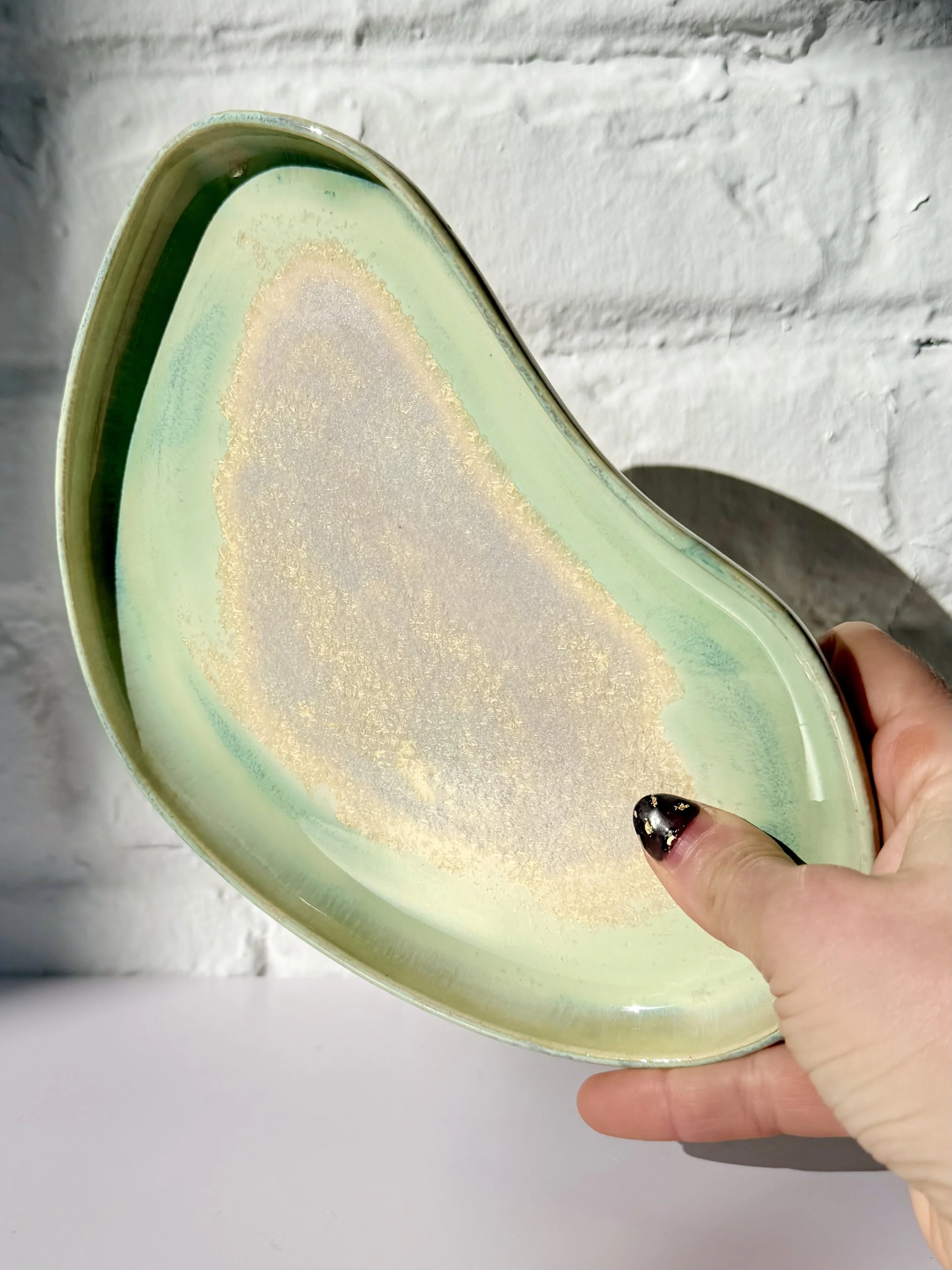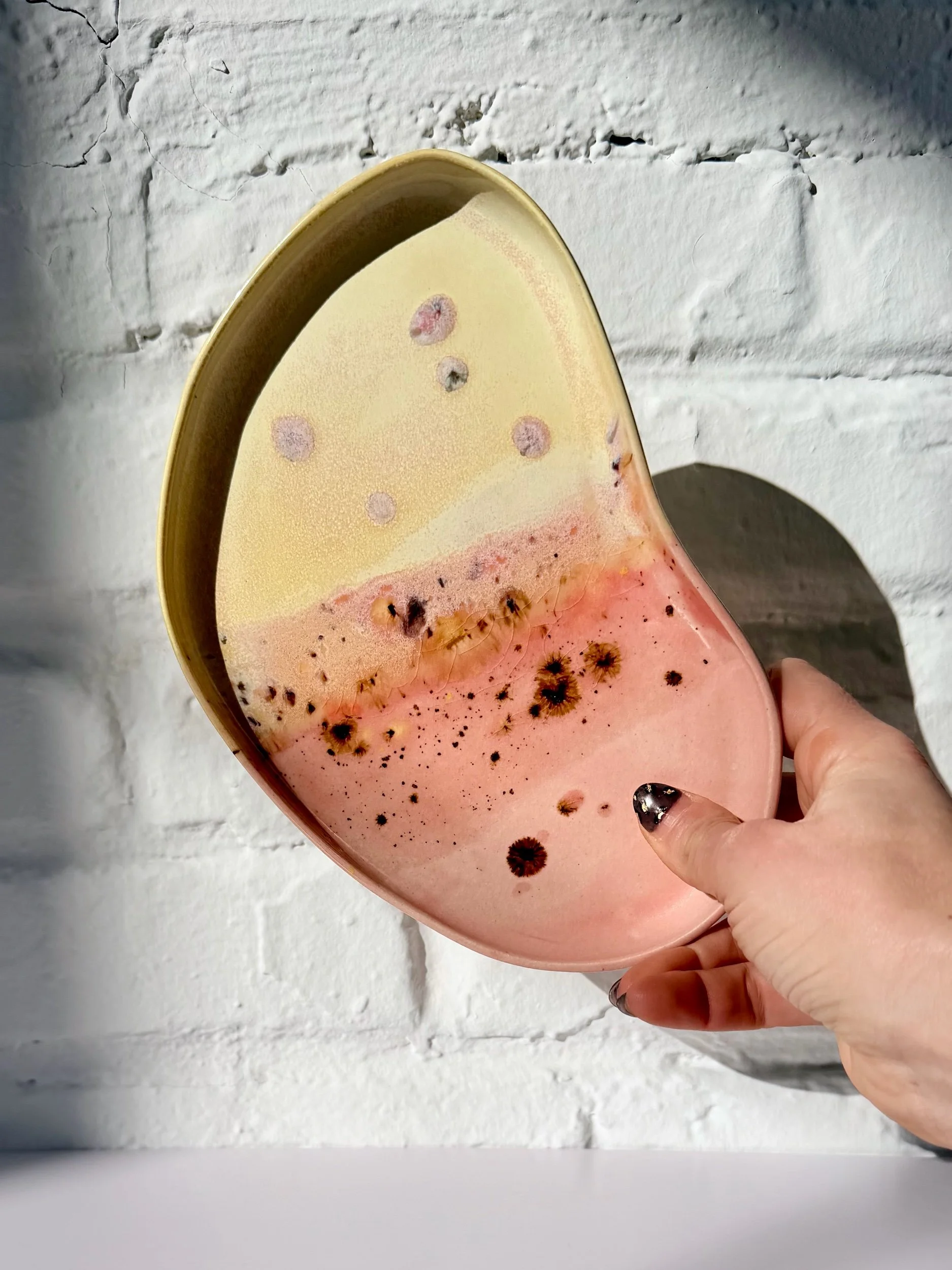 The Orbit Duo Platter is a handmade oval ceramic piece designed for everyday versatility. Featuring an attached small bowl, it can be used for serving, holding small objects, or styling as a simple catchall. Each platter is one of a kind, made to bring quiet beauty and function to any space.